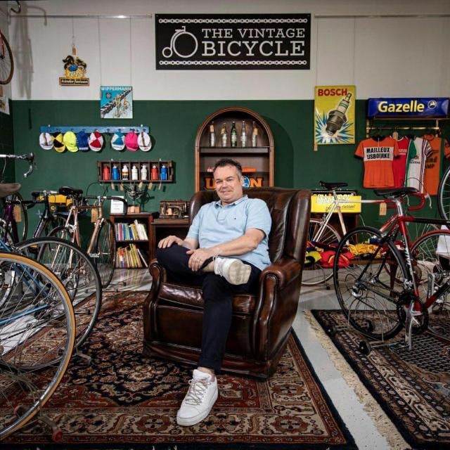 Frankie van den Elzen heeft van zijn hobby zijn beroep kunnen maken en runt samen met zijn vrouw zijn eigen bedrijf The Vintage Bicycle. “Het is allemaal hobbymatig begonnen”, vertelt de vader van twee kinderen. “Ik heb altijd gevoetbald en had toen al affiniteit met het zogenaamde vintage spul. Toen ik van school af ging ben ik toevallig in de fietswereld gerold. Begonnen bij de plaatselijke rijwielzaak stapte ik later over naar AGU. Eerst op kantoor en later als vertegenwoordiger. Ik deed toen al een beetje in oude fietsen en dat werd meer en meer. Vervolgens ben ik het serieuzer op gaan pakken en combineerde ik het met parttime werk in een rijwielzaak in Deurne. In 2011 ben ik voor mezelf begonnen en handel ik in de meest brede retrozin van het woord FIETS: documentatie, onderdelen, racefietsen, gewone fietsen… Voor mij is het elke dag feest. Het is niet zo dat alles wat ik aanraak in goud verandert, maar het is gewoon heel leuk om te doen en dan is het niet pers se werk te noemen.”