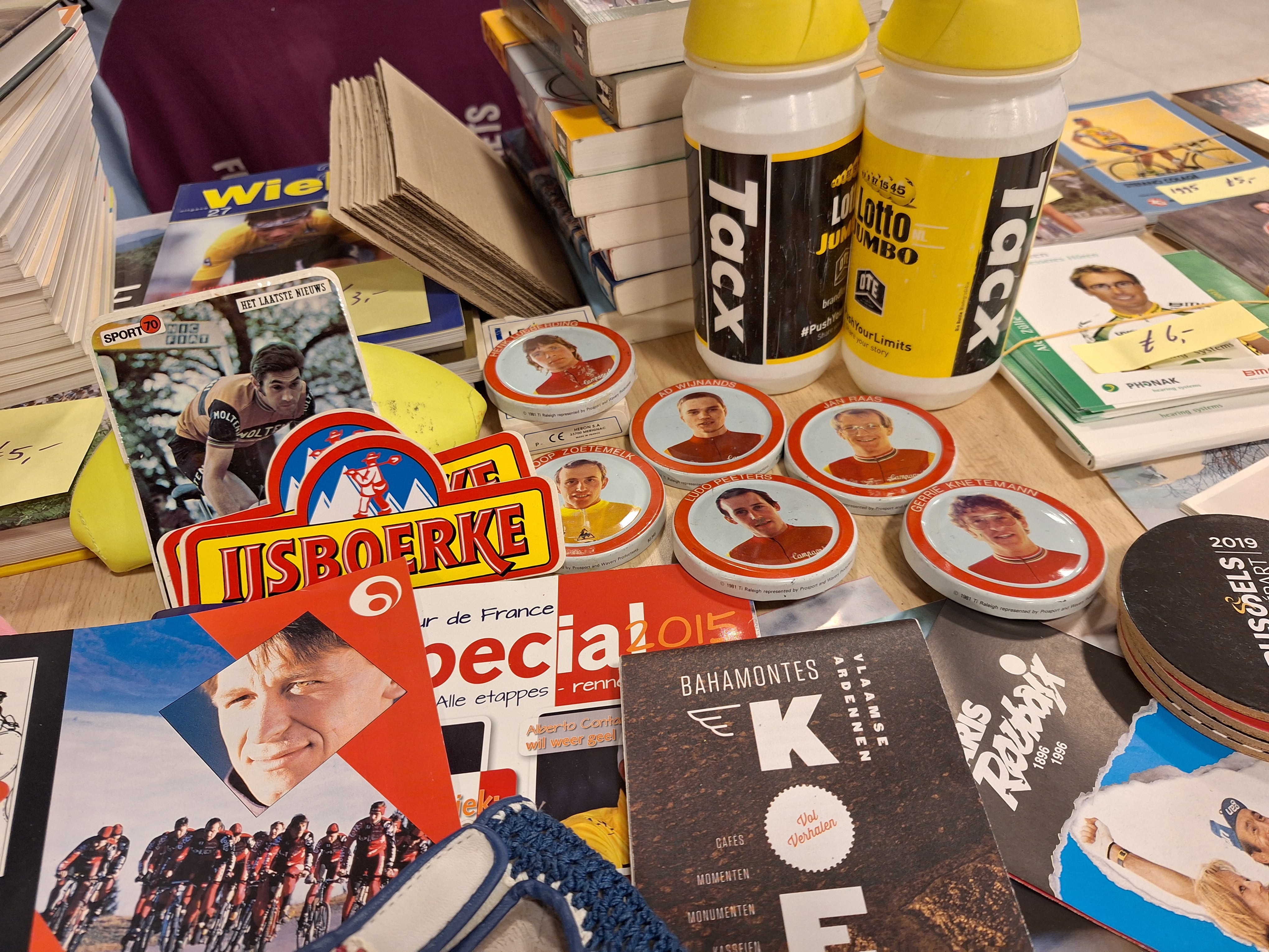 Alle zalen in het parochiecentrum zijn gevuld met onderdelen, wielen, complete fietsen, foto’s, boeken, memorabilia… Ook zetten we ons in voor het goede doel met de verkoop van unieke stenen en een heel bijzonder vogelhuisje!